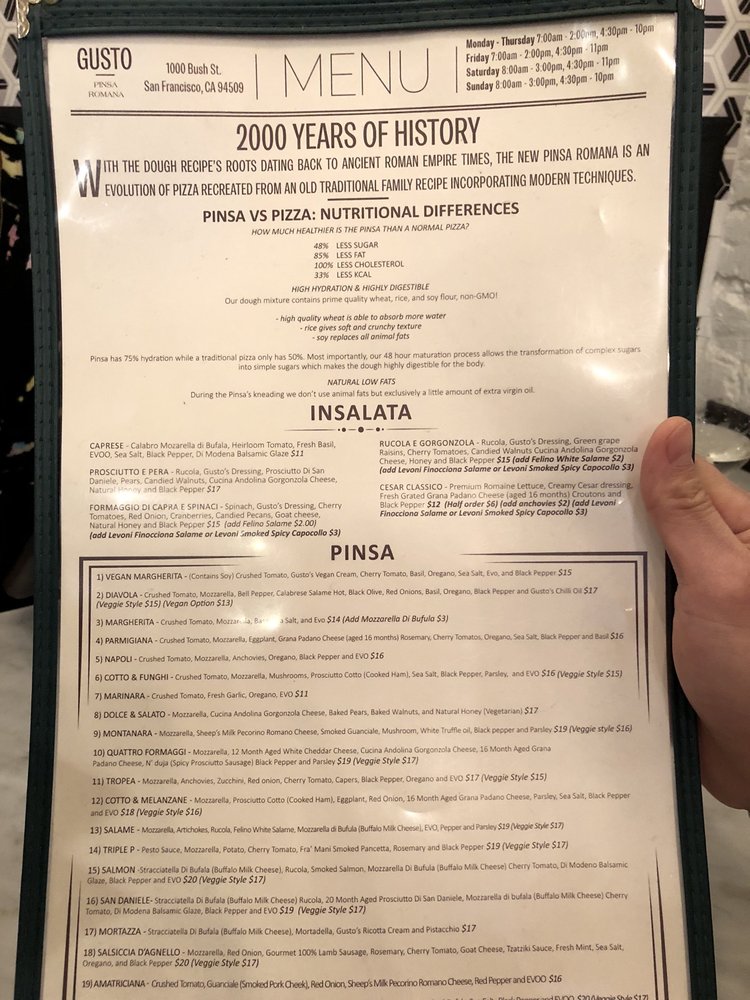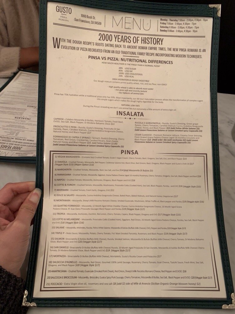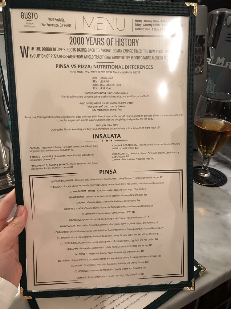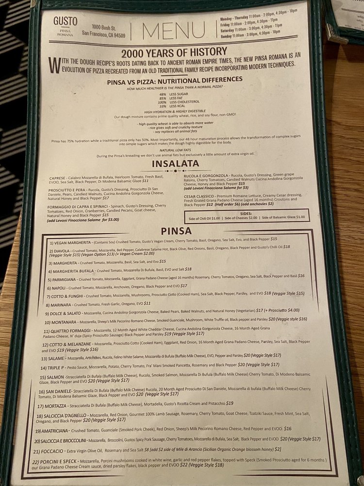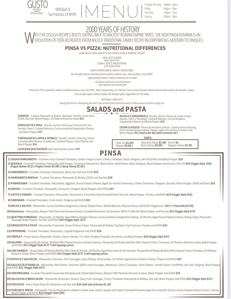 Introducing the menu at Gusto Pinsa Romana, a trendy and intimate restaurant offering a unique dining experience in San Francisco. The menu features delicious Pinsas, with options like the Vegan Margherita and Diavola Pinsa, showcasing a blend of flavors and quality ingredients. The Insalata selection includes the Caprese and Prosciutto e Pera, perfect for those looking for light and refreshing starters. Customers rave about the friendly staff and the family-owned vibe of the restaurant, with praises for the light and airy crust of the Pinsas. Whether you're a pizza connoisseur or looking to try something new, Gusto Pinsa Romana is a must-visit spot for a memorable dining experience.