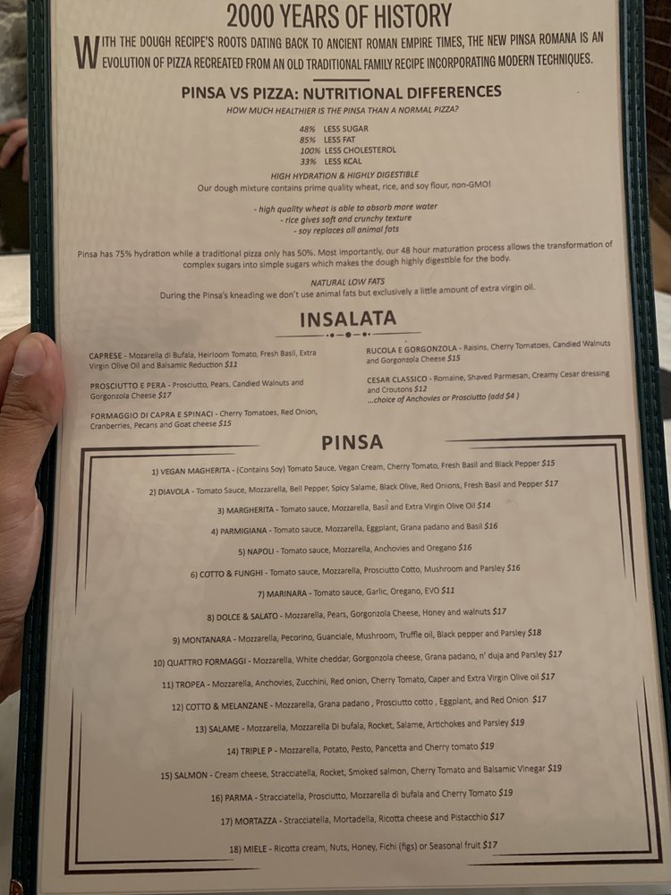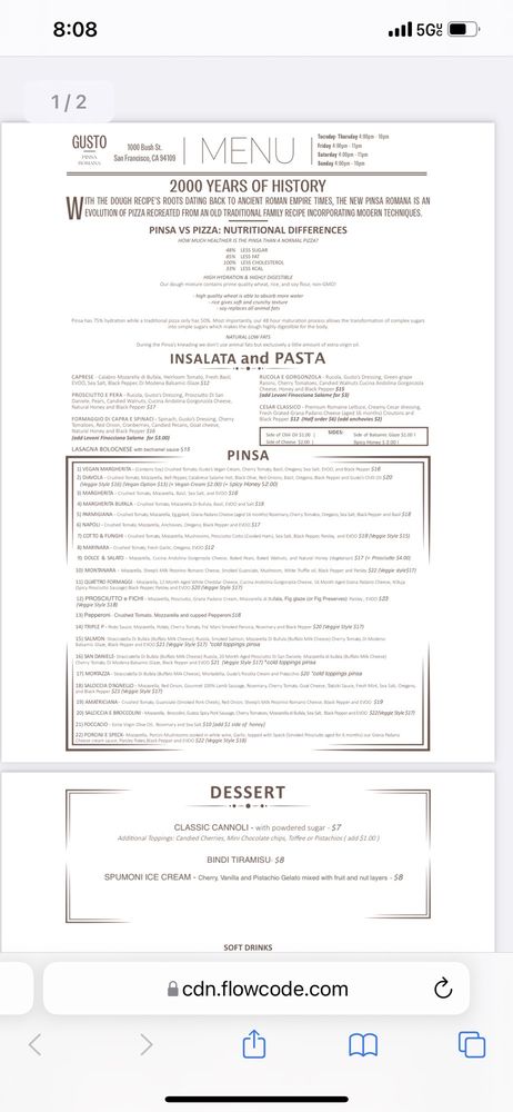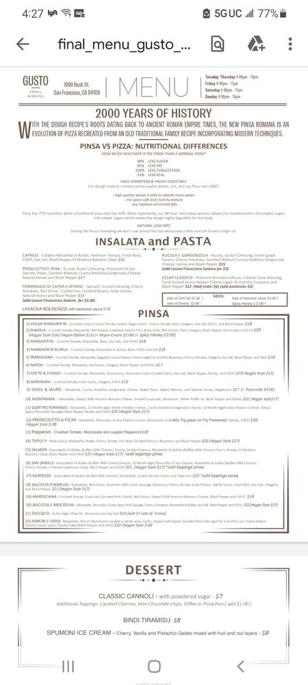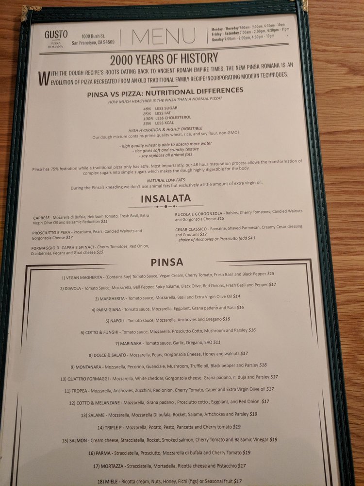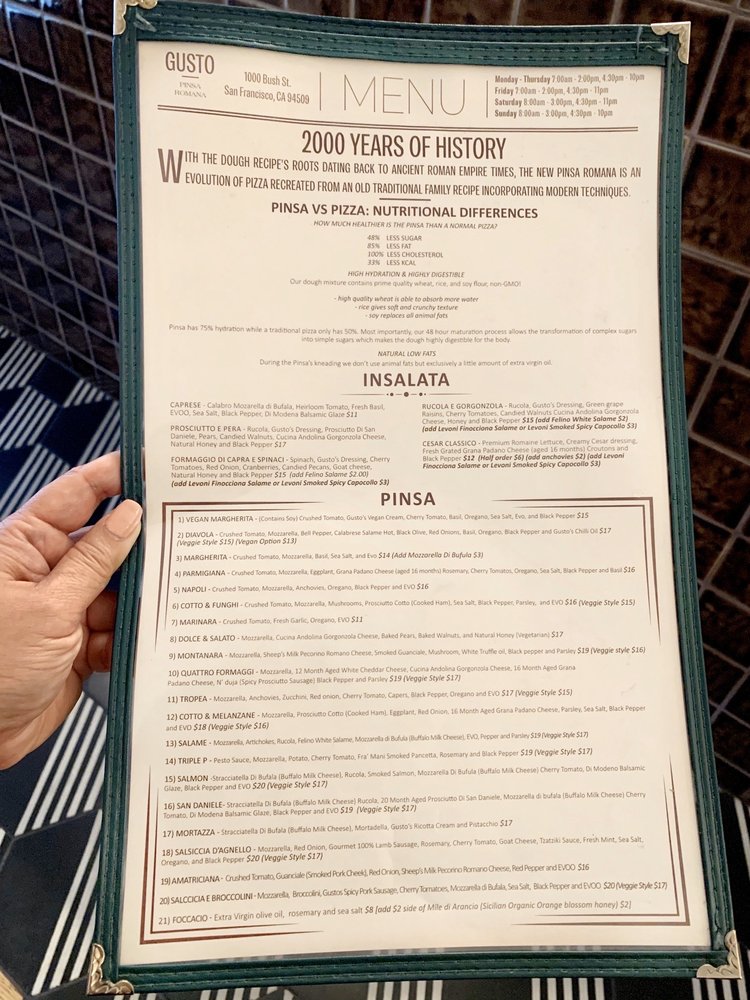 Introducing the menu at Gusto Pinsa Romana, a trendy and intimate restaurant offering a unique dining experience in San Francisco. The menu features delicious Pinsas, with options like the Vegan Margherita and Diavola Pinsa, showcasing a blend of flavors and quality ingredients. The Insalata selection includes the Caprese and Prosciutto e Pera, perfect for those looking for light and refreshing starters. Customers rave about the friendly staff and the family-owned vibe of the restaurant, with praises for the light and airy crust of the Pinsas. Whether you're a pizza connoisseur or looking to try something new, Gusto Pinsa Romana is a must-visit spot for a memorable dining experience.
